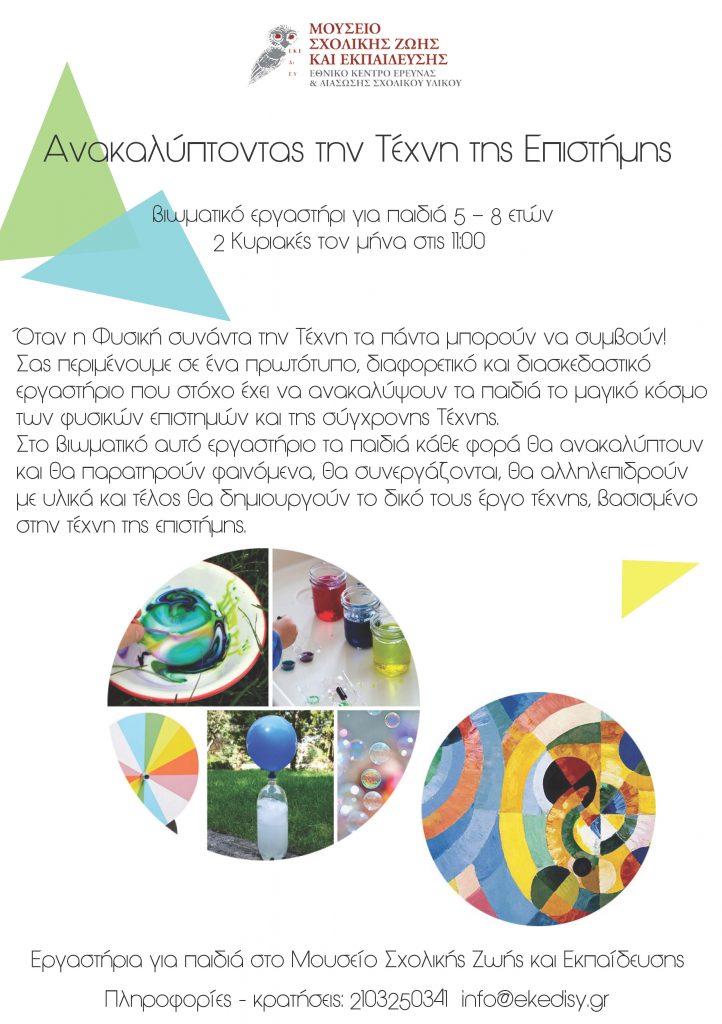 Όταν η Φυσική συνάντα την Τέχνη τα πάντα μπορούν να συμβούν! Σας περιμένουμε σε ένα πρωτότυπο, διαφορετικό και διασκεδαστικό εργαστήριο που στόχο έχει να ανακαλύψουν τα παιδιά το μαγικό κόσμο των φυσικών επιστημών και της σύγχρονης Τέχνης. Στο βιωματικό αυτό εργαστήριο τα παιδιά κάθε φορά θα ανακαλύπτουν και θα παρατηρούν φαινόμενα, θα συνεργάζονται, θα αλληλεπιδρούν με υλικά και τέλος θα δημιουργούν το δικό τους έργο τέχνης, βασισμένο στην τέχνη της επιστήμης.