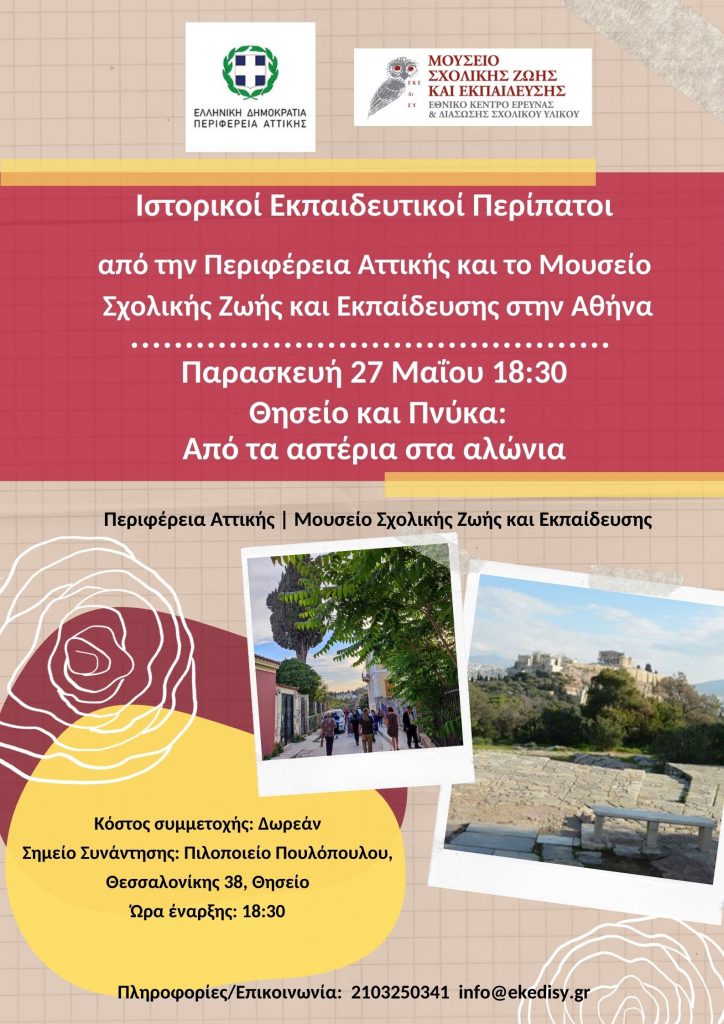 Ιστορικοί Εκπαιδευτικοί Περίπατοι από την Περιφέρεια Αττικής και το Μουσείο Σχολικής Ζωής και Εκπαίδευσης στην Αθήνα – Παρασκευή 27 Μαΐου 18:30 Θησείο και Πνύκα: Από τα αστέρια στα αλώνια