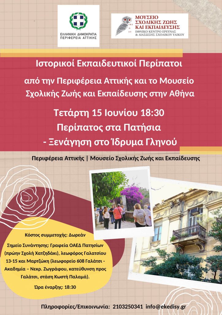 Ιστορικοί Εκπαιδευτικοί Περίπατοι από την Περιφέρεια Αττικής και το Μουσείο Σχολικής Ζωής και Εκπαίδευσης στην Αθήνα – Τετάρτη 15 Ιουνίου 18:30 Περίπατος στα Πατήσια – Ξενάγηση στο Ίδρυμα Γληνού