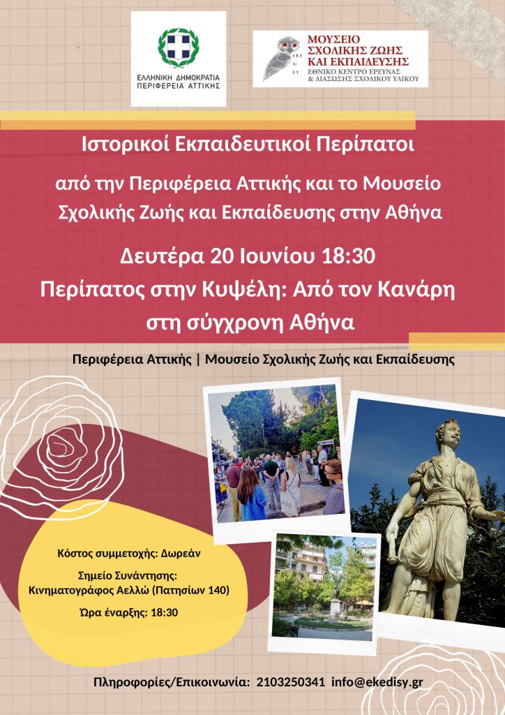 Ιστορικοί Εκπαιδευτικοί Περίπατοι από την Περιφέρεια Αττικής και το Μουσείο Σχολικής Ζωής και Εκπαίδευσης στην Αθήνα – Δευτέρα 20 Ιουνίου 18:30 Περίπατος στην Κυψέλη: Από τον Κανάρη στη σύγχρονη Αθήνα