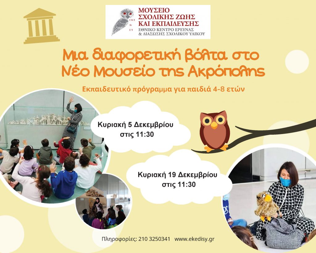 Μια διαφορετική βόλτα στο Νέο Μουσείο της Ακρόπολης που θα ξεκινήσει από τον αρχαιότερο δρόμο της Αθήνας, την οδό Τριπόδων και το Μουσείο Σχολικής Ζωής, όπου ο Παρθενώνας στο λόφο της Ακρόπολης φαντάζει στα μάτια των παιδιών σαν κάστρο ιπποτών! H κουκουβάγια η Σοφία, μια απ΄τις πολλές που ζουν από τα αρχαία χρόνια μέχρι σήμερα στη γειτονιά της Πλάκας, θα  βοηθήσει τα παιδιά να ξετυλίξουν τους μύθους και να ανακαλύψουν την ιστορία που κρύβουν τα αρχαία μνημεία της πόλης!