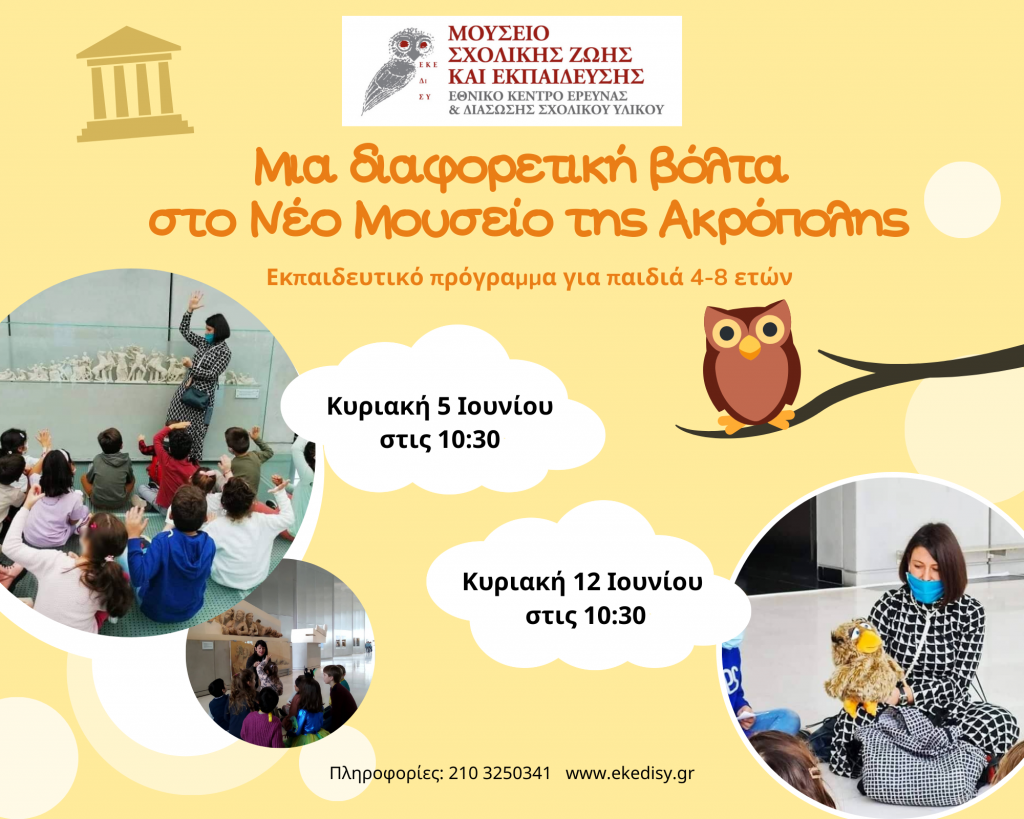 Μια διαφορετική βόλτα στο Νέο Μουσείο της Ακρόπολης από το Μουσείο Σχολικής Ζωής! H κουκουβάγια η Σοφία, μια απ΄τις πολλές που ζουν από τα αρχαία χρόνια μέχρι σήμερα στη γειτονιά της Πλάκας, θα βοηθήσει τα παιδιά να ξετυλίξουν τους μύθους και να ανακαλύψουν την ιστορία που κρύβουν τα αρχαία μνημεία της πόλης!