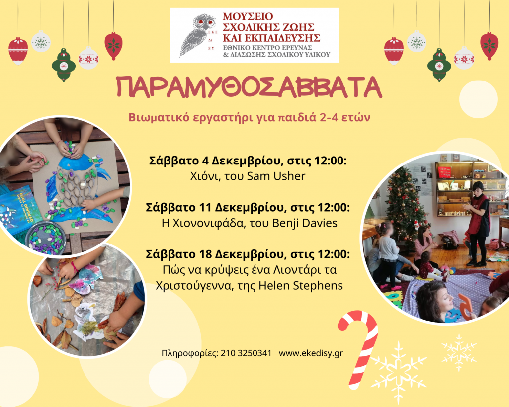 Μια έκπληξη περιμένει ένα μικρό αγοράκι και τον παππού μια ξεχωριστή χειμωνιάτικη μέρα… Στο πρώτο εργαστήριο του Δεκεμβρίου υποδεχόμαστε τους μικρούς μας φίλους μέσα από ένα υπέροχο εικονογραφημένο παραμύθι. Ελάτε να ανακαλύψουμε τις χιονισμένες σελίδες του βιβλίου αλλά και να δημιουργήσουμε μοναδικές κατασκευές.