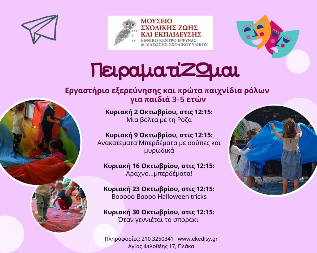 Κόστος Συμμετοχής: 12€ (ο κύκλος 5 εργαστηρίων Οκτωβρίου 50€).