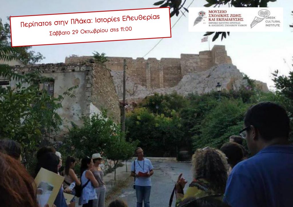 Το Σάββατο 29 Οκτωβρίου στις 11:00 το πρωί το Μουσείο Σχολικής Ζωής και Εκπαίδευσης  και το Greek Cultural Institute διοργανώνουν έναν διαφορετικό περίπατο για την 28η Οκτωβρίου, στα στενά της Πλάκας και κάτω από την Ακρόπολη.