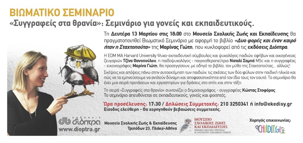 Τη Δευτέρα 13 Μαρτίου στις 18:00 στο Μουσείο Σχολικής Ζωής και Εκπαίδευσης θα πραγματοποιηθεί Βιωματικό Σεμινάριο με αφορμή το βιβλίο «Δυο φορές και έναν καιρό ήταν η Σταχτοπούτα» της Μαρίνας Γιώτη, που κυκλοφορεί από τις εκδόσεις Διόπτρα.