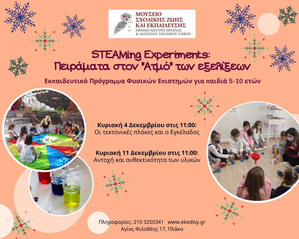 Ένα νέο εργαστήρι περιμένει τους μικρούς φίλους του Μουσείου Σχολικής Ζωής κι εκπαίδευσης. Ένα εργαστήρι γεμάτο Φυσικές Επιστήμες, Τεχνολογία, Μηχανική και ρομποτική θα καταπλήξει τους επίδοξους επιστήμονες και θα τους οδηγήσει σε επιστημονικά μονοπάτια με πυξίδα την Τέχνη και οδηγό τις βασικές αρχές της STEAM εκπαίδευσης.