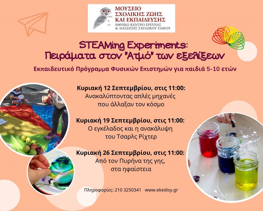 Ένα νέο εργαστήρι περιμένει τους μικρούς φίλους του Μουσείου Σχολικής Ζωής κι εκπαίδευσης. Ένα εργαστήρι γεμάτο Φυσικές Επιστήμες, Τεχνολογία, Μηχανική και ρομποτική θα καταπλήξει τους επίδοξους επιστήμονες και θα τους οδηγήσει σε επιστημονικά μονοπάτια με πυξίδα την Τέχνη και οδηγό τις βασικές αρχές της STEAM εκπαίδευσης.